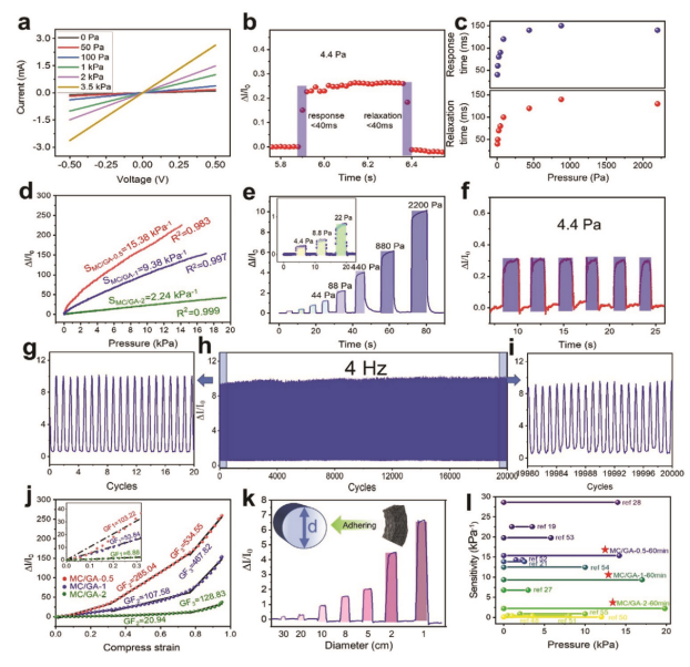 Figure 6. MC/GA-1-60 min的電學表征和壓阻傳感性能。a) I-V曲線作為施加壓力的函數;b) 4.4 Pa壓力傳感;c)不同施加壓力下的響應和恢復時間;d)壓敏特性;e) ΔI/I