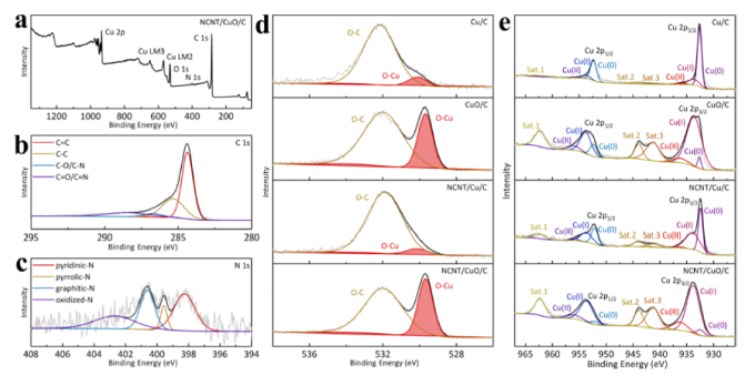 圖5 (a) XPS全譜;(b) NCNT/CuO/C的C 1s和(c) N 1s譜;Cu/C、CuO/C、NCNT/Cu/C和NCNT/CuO/C的(d) O 1s和(e) Cu 2p 的XPS。