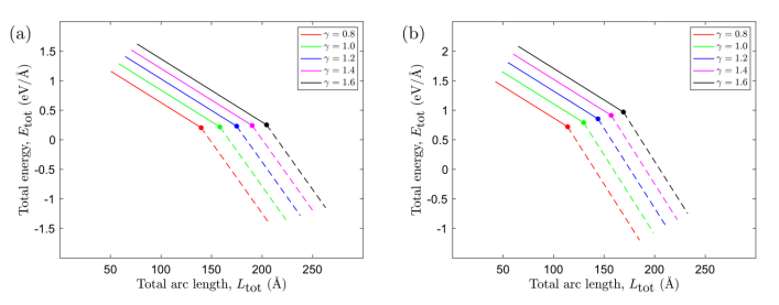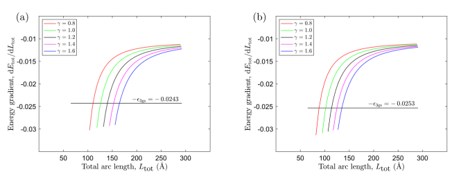 tot的函數(shù)。彩色線表示構(gòu)象A的能量梯度,黑線表示構(gòu)象B的能量梯度,其中交點給出了構(gòu)象A每個γ值的長度L