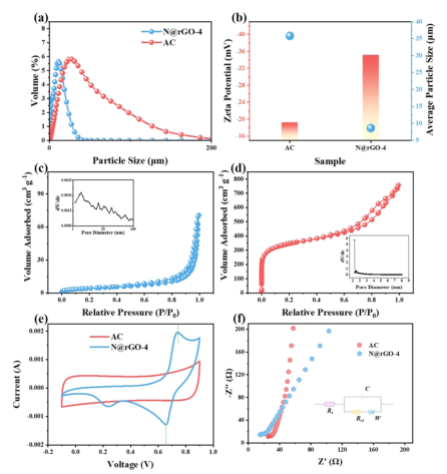 Figure 3.AC和N@rGO-4 (a)的粒度分布;ζ-AC和N@rGO-4 (b)的電位和平均粒徑,N@rGO-4 (c)和AC (d)的N2吸附/解吸等溫線和孔徑分布,AC和N@rGO-4 (e)的CV曲線,以及AC和N@rGO-4 (f)的EIS圖。圖(f)的插圖是相應(yīng)的等效電路。