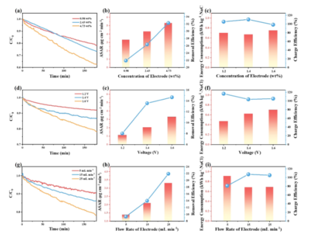 Figure 4.不同電極濃度下NaCl濃度的變化(a),ASRR和NaCl去除效率(b),AC-NVOPF@rGO FCDI系統(tǒng)的能耗和充電效率(c);不同電壓下NaCl濃度的變化(d),ASRR和NaCl去除效率(e),AC-NVOPF@rGO FCDI系統(tǒng)的能耗和充電效率(f);不同電極流速下的NaCl濃度變化(g)、ASRR和NaCl去除效率(h),AC-NVOPF@rGO FCDI系統(tǒng)的能耗和充電效率(i)。