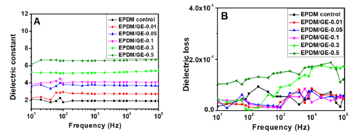 圖6. EPDM/石墨烯復(fù)合材料的介電性能:(a)介電常數(shù);(b)介電損耗。