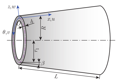 圖1. FG-GPLRC截錐殼模型及曲線坐標系。
