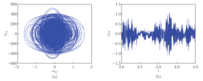 5時的混沌運動:(a)相位圖和(b)時程圖。