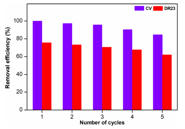 -1。研究發(fā)現(xiàn)吸附容量隨著GO用量、染料初始濃度和接觸時間的增加而增加,但隨著吸附劑用量的增加而降低。吸附過程采用準(zhǔn)二級動力學(xué)描述,平衡數(shù)據(jù)符合CV的Langmuir等溫線模型和DR 23吸附的Freundlich等溫線模型。通過吸附-解吸實驗研究了納米復(fù)合水凝膠的可重用性能,5次循環(huán)后對CV和DR23的去除率分別為99–84%和75–61%。