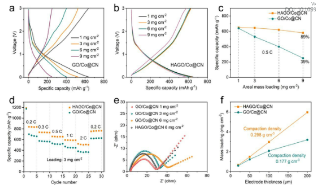 石墨烯基2D材料由于其高電化學活性、快速載流子遷移率和高電子電導率,它在電化學能量存儲方面顯示出非凡的前景。然而,低的比容量(< 200 mAh g-1)和有限的離子傳輸嚴重阻礙了它們的實際應(yīng)用。這里,使用金屬-有機骨架衍生的鈷@碳氮(Co@CN)修飾的水平排列氧化石墨烯(HAGO/Co@CN)陣列,作為獨立陽極來解決這個問題,在高面積容量(> 5mAh cm−2)下實現(xiàn)穩(wěn)定的循環(huán)測試。HAGO/Co@CN電極中高度互穿的氧化石墨烯框架加速了電子傳輸。此外,得益于先進的層狀結(jié)構(gòu),HAGO/Co@CN電極表現(xiàn)出優(yōu)異的結(jié)構(gòu)穩(wěn)定性和厚度無關(guān)的電化學性能。通過系統(tǒng)地調(diào)整電極內(nèi)部GO/Co@CN納米片的取向,優(yōu)化電子/離子傳輸,在高載量下實現(xiàn)了高面容量和高速率特性。更重要的是,用NCM622作為陰極和GO/Co@CN作為陽極設(shè)計的全電池,在500次循環(huán)后,高容量保持率高于98%,具有商業(yè)級的可逆容量(2.3 mAh cm−2)。