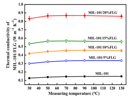 Figure 3. MIL-101/FLG 復(fù)合材料和 MIL-101 在不同測量溫度下的熱導(dǎo)率。