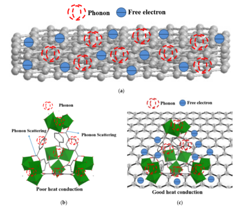 Figure 6. (a) FLG, (b) MIL-101和(c) MIL-101/FLG 復(fù)合材料的結(jié)構(gòu)及導(dǎo)熱機(jī)理示意圖。