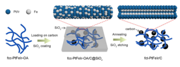 Figure 1. 二氧化硅保護(hù)策略制備fct-PtFeIr/C催化劑的原理示意圖。