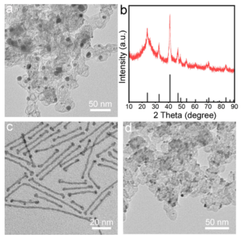Figure 3. 對(duì)照樣品的形貌和成分表征。fct-PtFeIr/C-no SiO2樣品的a) TEM圖像和b) 的XRD圖。c) fcc-PtFe納米線和d) fcc-PtFe-1/C樣品的TEM 圖像。