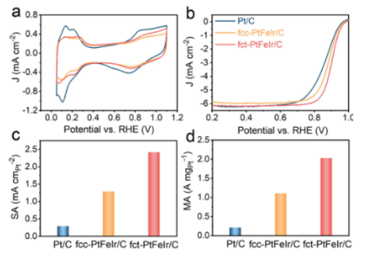 Figure 4. fct-PtFeIr/C、fcc-PtFeIr/C和商業(yè) Pt/C的ORR活性。a) 在N2飽和的 0.1 M HClO4 電解液中的CV 曲線。b) 在O2飽和的0.1 M HClO4 電解液中的ORR極化曲線。c) SA和d) MA直方圖。