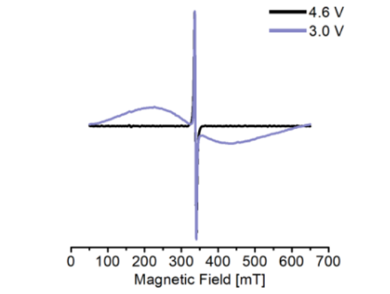 (紫線)后的X波段EPR光譜。光譜中心的尖峰對應(yīng)于復(fù)合材料中的導(dǎo)電碳,而放電時觀察到的寬線形被指定為NMC811。