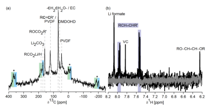 下分解。MAS 頻率 = 28 kHz。 星號表示旋轉(zhuǎn)邊帶。(b) NMC811/Li 電池在 NMR管電池中的原位溶液