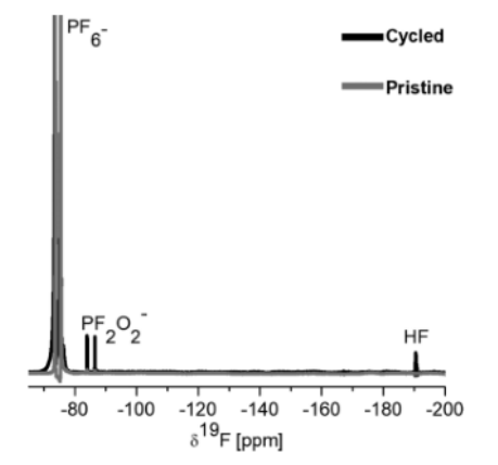 H NMR,在 C/10 在 3.0 和 4.6 V(黑色)之間進(jìn)行 10 次恒電流循環(huán)后,與原始電解質(zhì)(灰色)的 NMR 譜重疊。