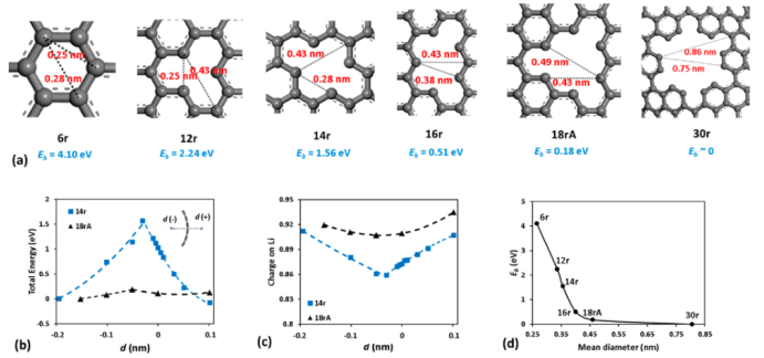 對于14r環(huán)和18rA環(huán),計(jì)算的配置(b)的總能量和Li(c)上的Bader電荷是d的函數(shù)。E