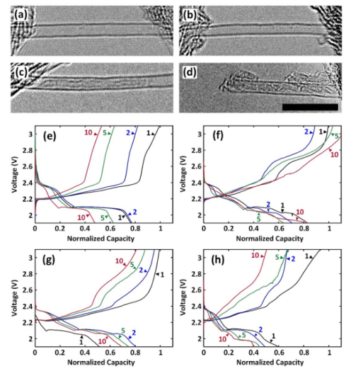 圖 5. (a) S@CNT (raw)、(b) S@CNT (375 K)、(c)S@CNT (475 K)和(d)S@CNT(575 K)的HRTEM 圖像5 nm的比例尺。氧化產(chǎn)生足夠大的開環(huán),僅在475 K以上才能有效填充硫。S@CNT陰極與未氧化的 CNT(e)和在375 K(f)、475 K(g)和575 K (h)不同溫度下氧化的CNT 的循環(huán)性能。容量被歸一化為電池第一次循環(huán)的完全放電容量。