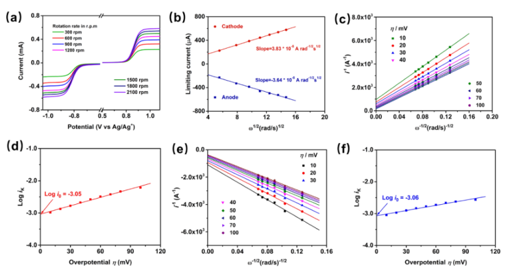 -1/2 的線性擬合 Koutecky-Levich 圖; 和 (d, f) logikas 的擬合圖是過電位 (η) 的函數(shù)。