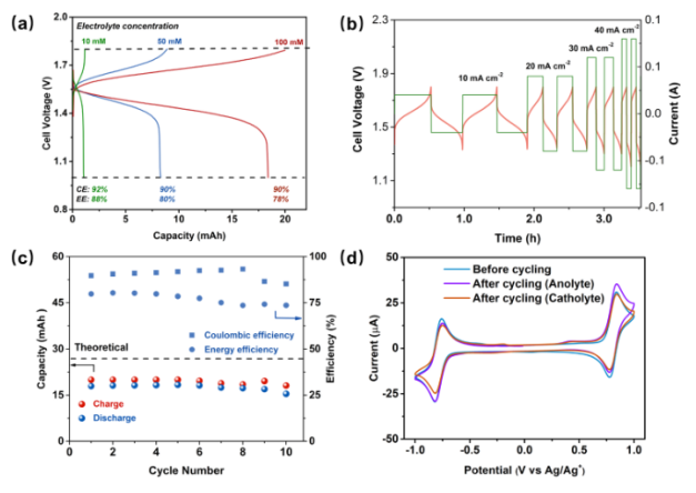 圖6. (a)在不同濃度下具有庫侖效率和能量效率的流通池的代表性充放電曲線。(b)隨著電流密度從 10 mA cm