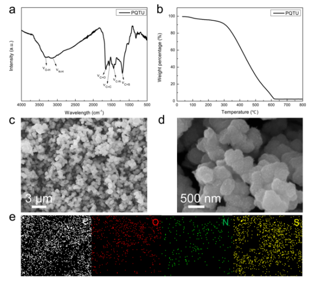 圖 2. PQTU 的表征。(a) FT-IR光譜。(b)TG 曲線(xiàn)。(c)和(d)SEM圖像。(e) C、O、N和S 的元素映射。