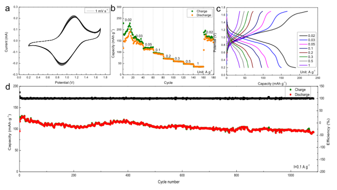 -1下100個(gè)循環(huán)的CV曲線(xiàn)。(b) PQTU∥ZnSO4∥Zn電池的倍率性能。(c)不同電流密度下的充放電曲線(xiàn)。(d)PQTU∥ZnSO4∥Zn電池在0.1Ag