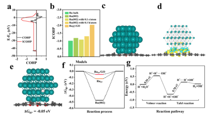57/GO的最佳氫吸附構(gòu)型及其對應(yīng)的ΔGH*。(f)計算出Ru(002)、Ru