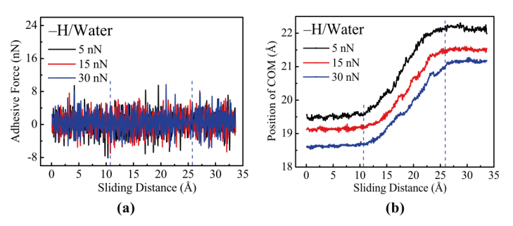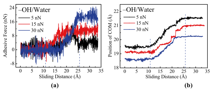 圖2.在水環(huán)境中被羥基鈍化的石墨烯臺階滑動時(shí) (a)粘附力的變化和(b)尖端COM的位置隨滑動距離的變化。