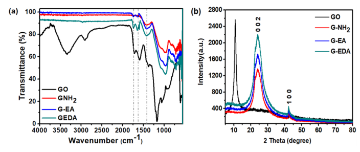 2、G-EA和G-EDA的(a)FT-IR光譜和(b) XRD光譜。
