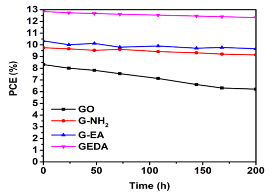 2)、石墨烯-乙醇胺(G-EA)和石墨烯乙二胺(G-EDA)被合成并測試其作為鈣鈦礦太陽能電池(PSCs)應(yīng)用的空穴傳輸層(HTL)。在對石墨烯類衍生物的評估中,石墨烯-乙二胺(G-EDA)制備的PSCs功率轉(zhuǎn)換效率最高,為12.9%。與其他NGs相比,基于G-EDA的PSCs功率轉(zhuǎn)換效率的增強歸因于均勻覆蓋、更快的空穴傳輸和更大的鈣鈦礦晶體生長模板。此外,用基于G-EA和G-EDA的HTLs制備的PSCs的功率轉(zhuǎn)換效率在光照200 h后仍保持穩(wěn)定。