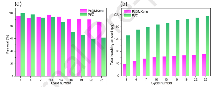 圖7 (a) Pt/C和1% Pt@MXene對CAP降解的可重復(fù)使用性;(b)在1% Pt@MXene和Pt/C條件下,25次穩(wěn)定性試驗循環(huán)的總浸出量。
