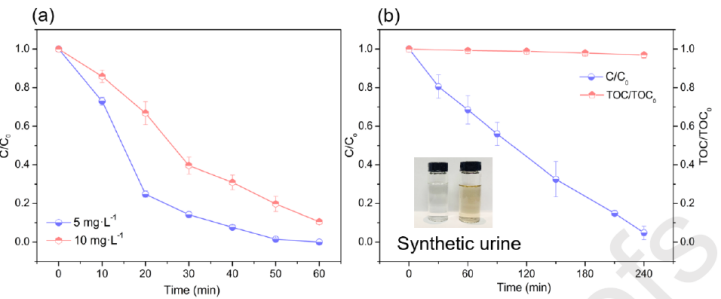 圖8。(a)不同濃度的CAP在1% Pt@MXene上的降解,(b) TOC的演化和CAP在合成尿介質(zhì)中的降解,圖中:電還原前和電還原后的合成尿。