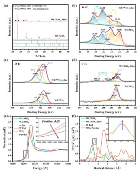 Figure 2. (a) XRD圖譜,(b) W 4f,(c) O 1s和(d) C 1s XPS光譜,以及相應(yīng)的(e)W L3-邊緣XANES光譜和(f)R-空間中的EXAFS光譜。