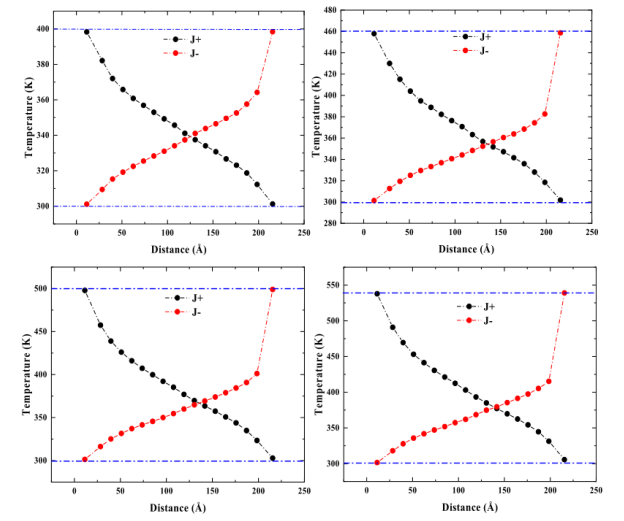 圖4. 石墨烯在不同熱源溫度(400、460、500、540K)下的典型溫度分布。