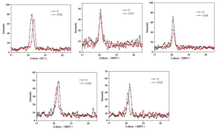 圖3. C和CG4在不同溫度下的XRD(17°-20.5°)掃描圖譜。