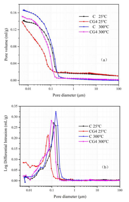 圖5. C和CG4在加熱前后的(a)累積孔隙體積和(b)孔隙體積差。