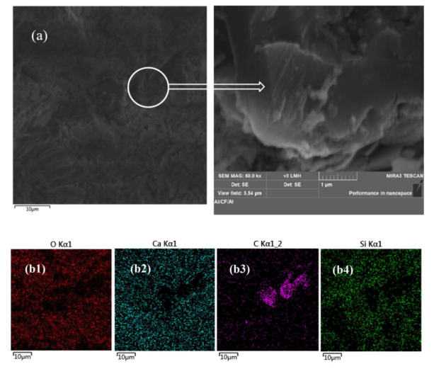 圖8. CG4的(a)SEM圖和(b)X-射線圖(bl:氧元素;b2:鈣元素;b3:碳元素;b4:硅元素)。