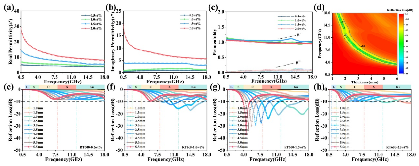 Figure 3. (a,b)介電常數(shù),(c)不同負(fù)載下rGO的磁導(dǎo)率。(d) 還原溫度為600 ℃的 1.5 wt% 復(fù)合材料的 RL 與厚度和頻率的關(guān)系。rGO在600℃還原溫度下不同負(fù)載量的 RL (e) 0.5 wt% (f) 1.0 wt% (g) 1.5 wt% (h) 2.0 wt%。