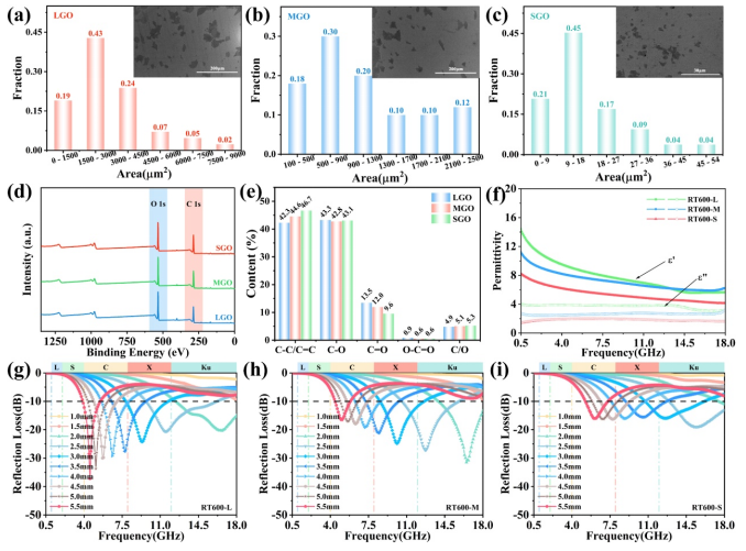 Figure 5. (a-c) LGO、MGO 和 SGO 的 SEM 圖像和尺寸分布。 (d) XPS 光譜,(e) GO 在不同片材尺寸下的特征參數(shù)。 (f) 介電常數(shù),(g-i) rGO 與不同薄片的反射損耗。