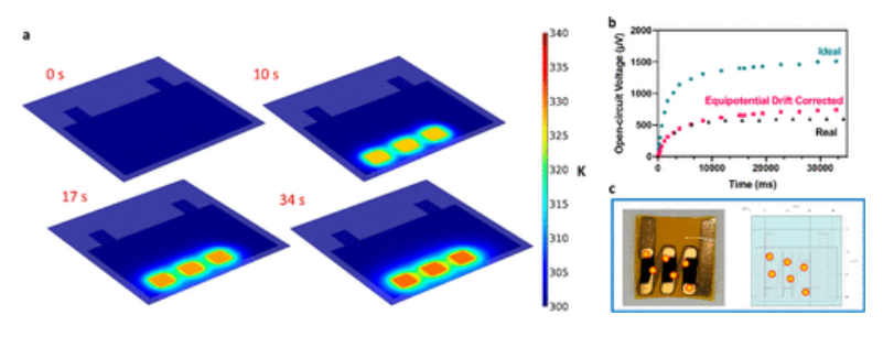 Figure 6. 通過 COMSOL 軟件模擬的制造的柔性納米微器件的理想輸出性能。所有參數(shù)均取自實際測量值。 (a) 器件在不同曝光時間下的散熱。 (b) 理想 OCV、等電位漂移校正 OCV 和實際 OCVn。 (c) 所制備設(shè)備的數(shù)碼照片和仿真模型。準(zhǔn)確的連接點用黃點標(biāo)記。