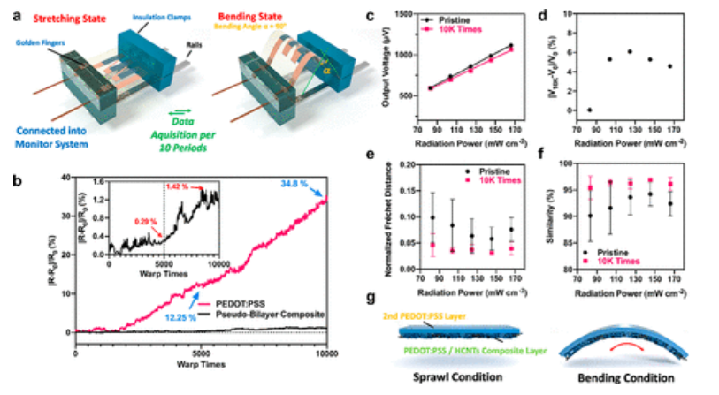 0 值與 10000 次彎曲循環(huán)前后的照明功率的關(guān)系。 (e) 歸一化 Fréchet 距離和 (f) 在 10000 次彎曲循環(huán)之前/之后在不同照明功率下設(shè)備的任意輸出信號的相似性。 (g) 拉伸和彎曲狀態(tài)下的贗雙層結(jié)構(gòu)薄膜結(jié)構(gòu)示意圖。