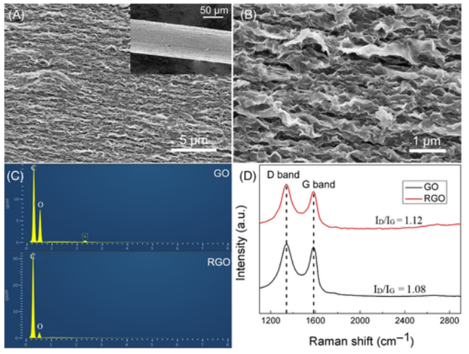 Figure 2. (A) 和 (B) RGO 纖維在不同放大倍率下的橫向 SEM 圖像。 (C) 和 (D) 分別為 GO 和 RGO 的 EDS 和拉曼光譜。