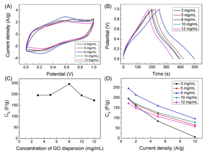 -1 時(shí)的 Cs。 (D) Cs 對(duì) GO 分散濃度和電流密度的依賴性。