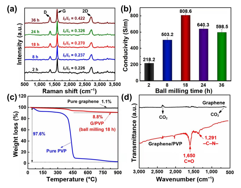 Figure 3. (a) 不同球磨時(shí)間制備的 G/WPU 薄膜的拉曼光譜。 (b) 不同球磨時(shí)間制備的 G/WPU 薄膜的電導(dǎo)率。 (c) 純 PVP、石墨烯和 G/PVP 的 TGA 曲線。 (d) 原始石墨烯和 G/PVP 樣品的 FTIR 光譜曲線。