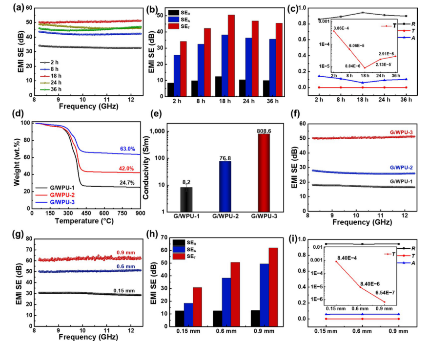 Figure 4. (a) 不同球磨時(shí)間制備的 G/WPU 薄膜在 X 波段頻率范圍內(nèi)的 EMI 屏蔽性能。 (b) X 波段中平均 SE 吸收、SE 反射和 SE 總和的總結(jié)。 (c) G/WPU 薄膜的反射率 (R)、吸收率 (A) 和透射率 (T) 值的相應(yīng)功率系數(shù)。 (d) 不同石墨烯含量的 G/WPU 薄膜的 TGA 曲線、(e) 電導(dǎo)率和 (f) EMI SE。 (g) 不同厚度的 G/WPU 薄膜的 EMI SE。 (h) 不同厚度的平均 SE 吸收、SE 反射和 SE 總和的總結(jié)。 (i) 不同厚度的 G/WPU 薄膜的 R、A 和 T 值的對(duì)應(yīng)功率系數(shù)。