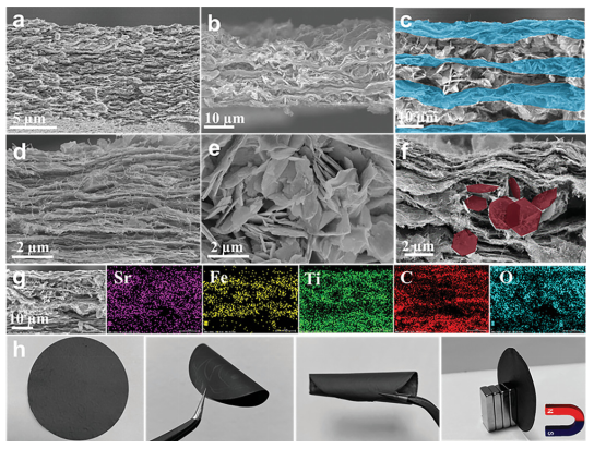 19薄膜的結構表征。a,d) MCF-1, b,e) MSF-1和c,f) MCSF-10的截面SEM圖像。g)元素映射和h) MCSF的數(shù)碼照片,顯示薄膜的柔韌性和磁性。