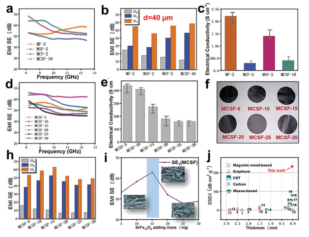 圖4. EMI屏蔽性能。a - c) EMI SE;SET、SEA、SER的比較;以及MF-2、MSF-2、MCF-2、MCSF-10在40 μ m厚度下的導電性能。,d,i) EMI SE, e)電導率,f)數(shù)碼照片,h) MCSF-5、MCSF-10、MCSF-15、MCSF-20、MCSF-25的SET、SEA、SER比較。j)電磁干擾屏蔽效能隨厚度變化的比較。