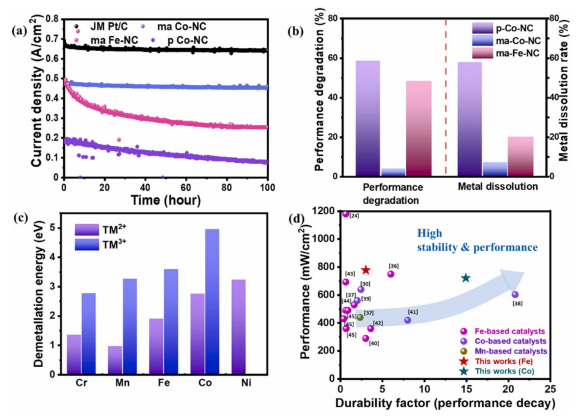 4 活性位點(diǎn)計(jì)算的每個(gè)過渡金屬離子的脫金屬能。 (d) 過渡金屬基催化劑與耐久性相關(guān)的燃料電池性能比較(耐久性因子 = 1/(損失%/小時(shí)))
