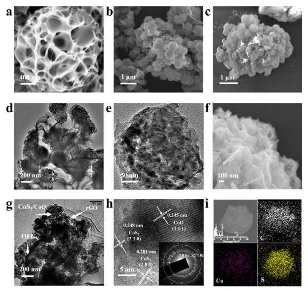 2/CoO 不同放大倍率的 TEM 圖像,(f) SEM 圖像,(g) TEM 圖像,(h) 帶有嵌入 SAED 圖案的 HRTEM 圖像,以及 (i) 元素映射與 OFC@ 的 EDS CoS