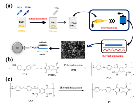 商用聚烯烴隔膜由于熱穩(wěn)定性差,經常導致鋰離子電池爆炸和熱失控。 因此,各種具有高熱穩(wěn)定性的聚合物隔膜引起了研究人員的關注。本文通過在靜電紡絲前向PAA溶液中加入一定含量的納米TiO