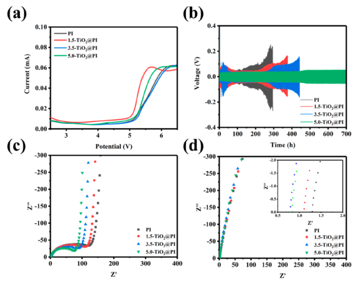 2||Li 電池的電化學阻抗譜 (c) 和 SS||SS 電池的奈奎斯特圖 (d) 與PI隔板和1.5- TiO