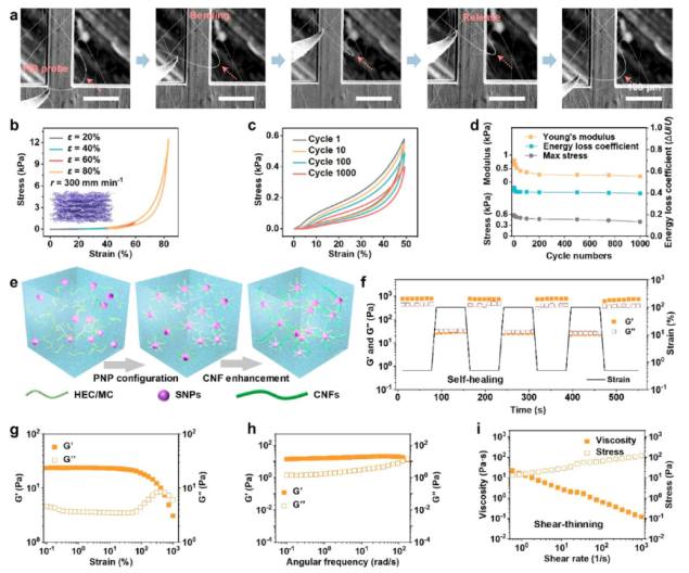 , 25 ℃)和頻率(ε = 2%, 25℃)的函數(shù)的 PNP 水凝膠的振蕩剪切流變學。 (i) PNP 水凝膠的穩(wěn)定剪切流變學。